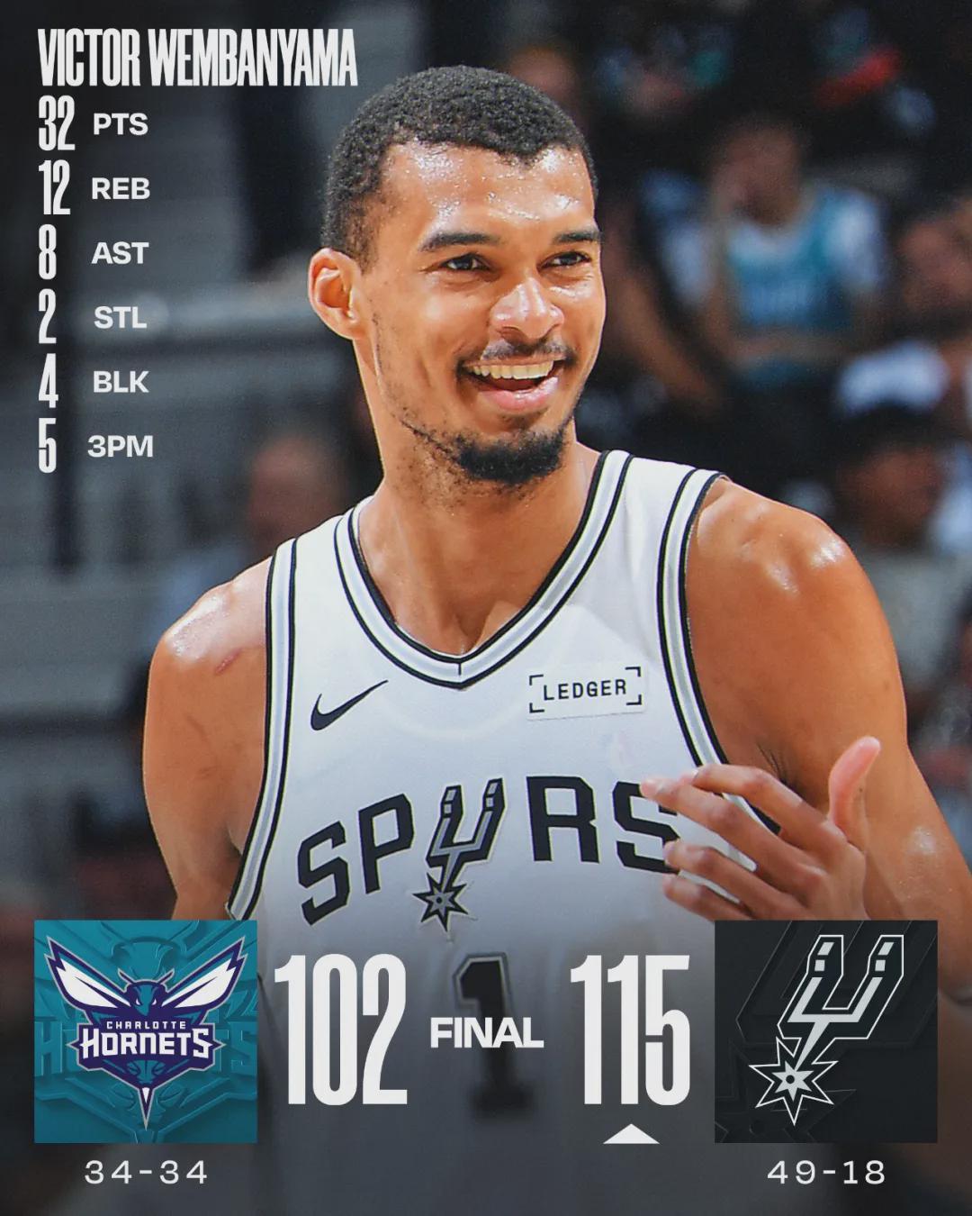 马刺近18战豪取16胜2负,此役过后,马刺49胜18负依然排名联盟第二,落后第一的雷霆3个胜场,领先活塞0.5个胜场。赛后接受采访时,文班说道:“我现在关心的是如何保养身体,因为我想拿MVP和DPOY,所以我一直全力以赴!”