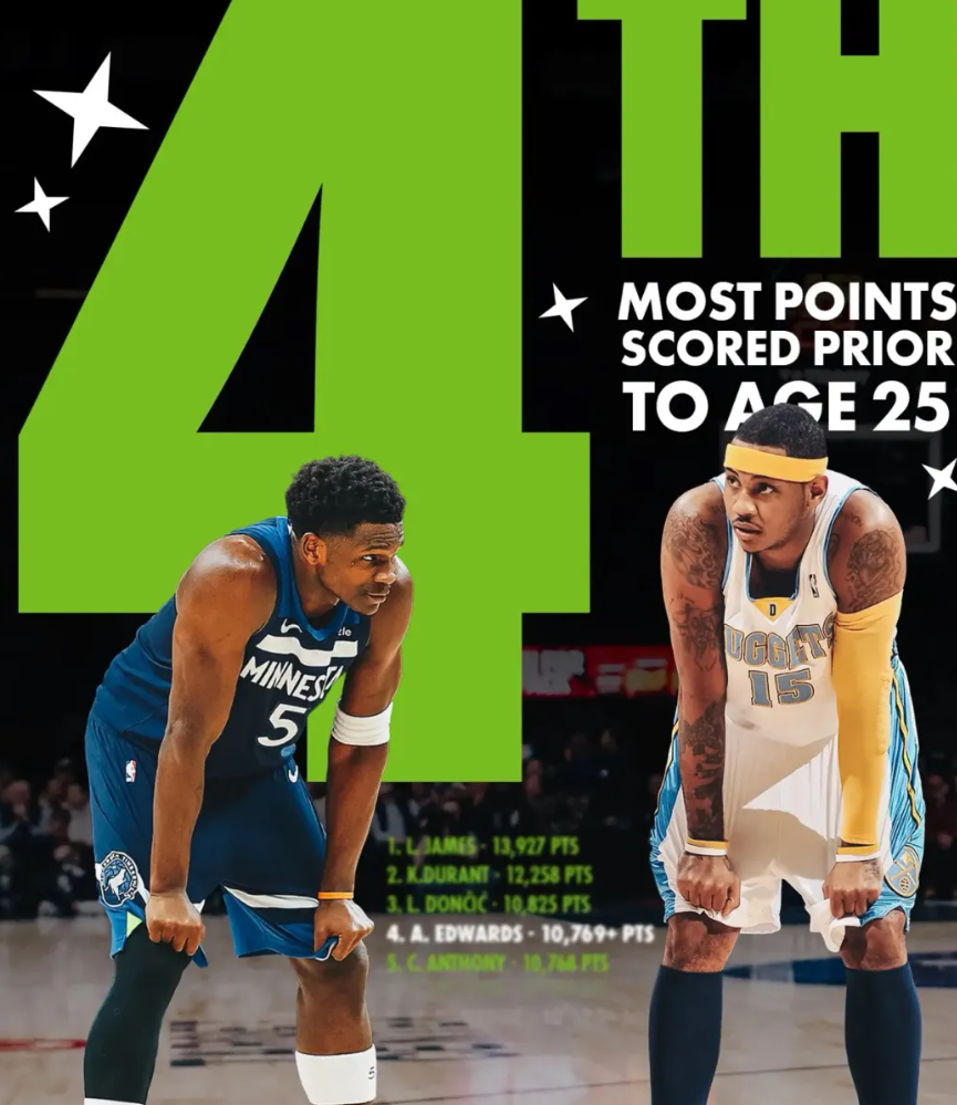据统计,爱德华兹的NBA生涯总得分已经超过了10768分,正式超越“甜瓜”安东尼,跃升到了“NBA25岁前球员得分榜”的第4名。排在爱德华兹前面的,是詹姆斯的13927分、杜兰特的12258分和东契奇的10825分。