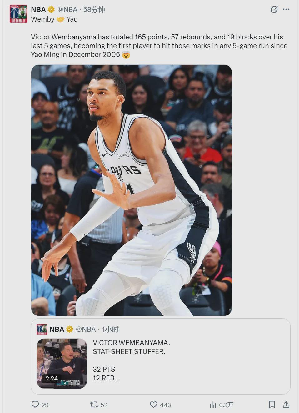 NBA官方写道:“文班亚马在过去的5场比赛一共得到165分、57个篮板和19次盖帽,成为自2006年12月姚明以来,首位在连续5场比赛达成这些数据的NBA球员。”当时火箭队的赛季场均得分只有90多分,大家可以想象姚明有多强。