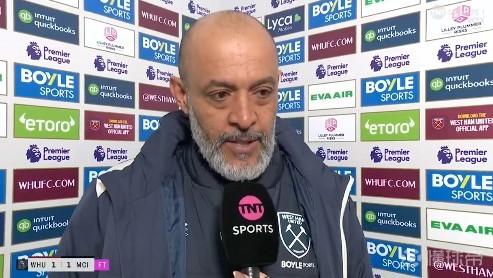 英超第30轮,西汉姆联主场1-1战平曼城,西汉姆联主帅努诺赛后接受了TNT体育的采访。